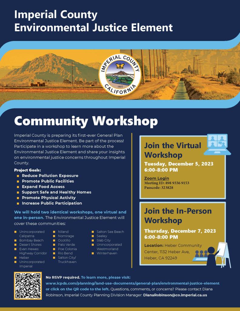 The Environmental Justice (EJ) Element is a legally required part of a General Plan, which is the overall planning document that sets the County’s policies for planning, development, and conservation. Under Senate Bill 1000 (SB 1000) of 2016, jurisdictions like Imperial County that contain environmental justice communities that are disproportionately affected by environmental pollution and other hazards are required to develop and adopt an EJ Element upon the update of two or more General Plan elements. The goal of an EJ Element is to address the compounded social, economic, and health issues faced by environmental justice communities, to promote community engagement in the public decision-making process, and to identify objectives and policies that prioritize improvements and programs that address the needs of environmental justice communities.