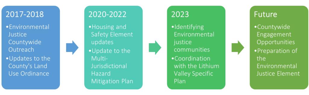 On June 30, 2022, Governor Gavin Newsom signed into law Senate Bill (SB) 125, providing funding to develop a Lithium Valley Specific Plan and Programmatic Environmental Impact Report (PEIR), and to distribute grants to local community-based organizations to conduct engagement related to the Specific Plan and PEIR. The Specific Plan process includes a significant environmental justice component, including community outreach and development of an Environmental Justice Working Group. This process is already underway and will integrate with the EJ Element process.
